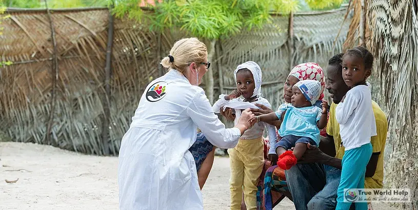 Im Rahmen eines medizinischen Außeneinsatzes in einem abgelegenen Dorf nahe Mombasa, Kenia, führte Dr. Sarah Johnson, ehrenamtliche Ärztin der TrueWorldHelp Organization, eine medizinische Untersuchung bei einem bedürftigen jungen Mädchen durch.